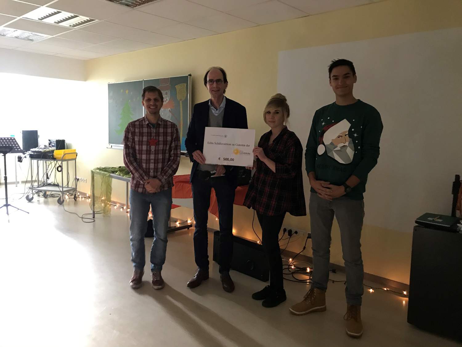 Das Geld stellten die künftigen Fachkräfte für Behindertenhilfe der „Aktion Lichtblicke“ für in Not geratene Kinder und Familien in Nordrhein-Westfalen zur Verfügung. Frank Haberstroh, Chefredakteur von Radio WAF, einem der 45 NRW-Lokalradios, die die Aktion unterstützen, nahm die Spende jetzt bei der Weihnachtsfeier des Berufskollegs in Ahlen entgegen. „Ich finde es toll, dass Ihr etwas mit Menschen für Menschen macht. Mit Eurer Ausbildung und Arbeit helft Ihr Menschen, und das ist das Beste, was wir füreinander tun können“, so der Chefredakteur.